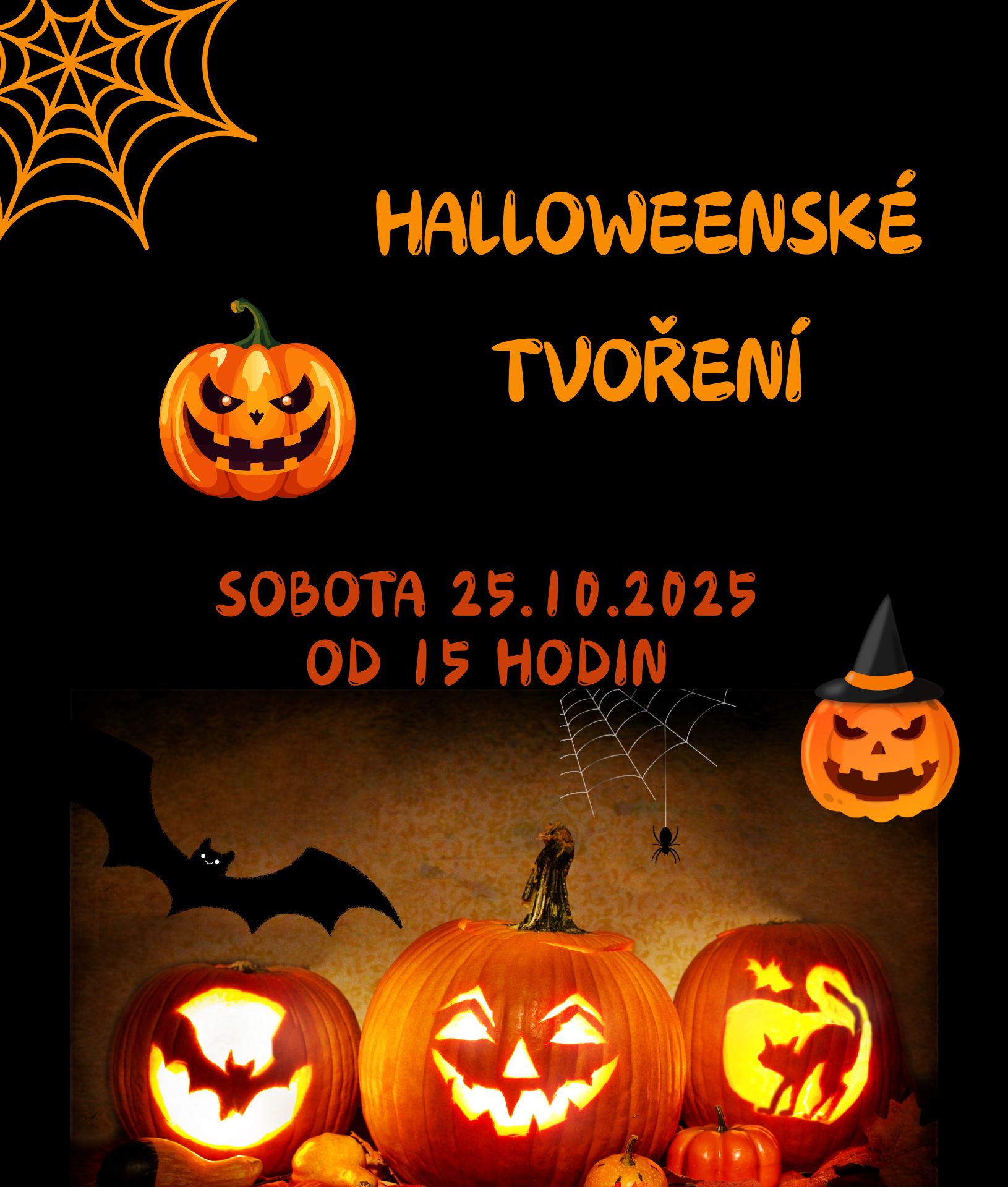 | 13.10 | Halloweenské tvoření Pozor, pozor, v sobotu 25.10.2025 od 15 hodin vytvoříme ty nejúžasnější dýně. Tentokrát je ale nebudeme dlabat, nýbrž na vás čeká překvapení, tak se těšte!!! |